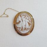 £399 Stock number: 61-12-021SECONDHAND GOLD 9ct gold Mythological Three Graces carved shell cameo brooch. Includes a fold down bale to allow it to also be worn as a pendant. Height 45mm, width 40mm.
