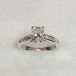 £4,999 Stock number: 12-72-008Round brilliant cut and pave princess cut diamonds solitaire ring. Principal stone weighs approx 0.95ct. Colour H-I, clarity SI1-SI2 assessed.18ct gold. New replacement value £10,000