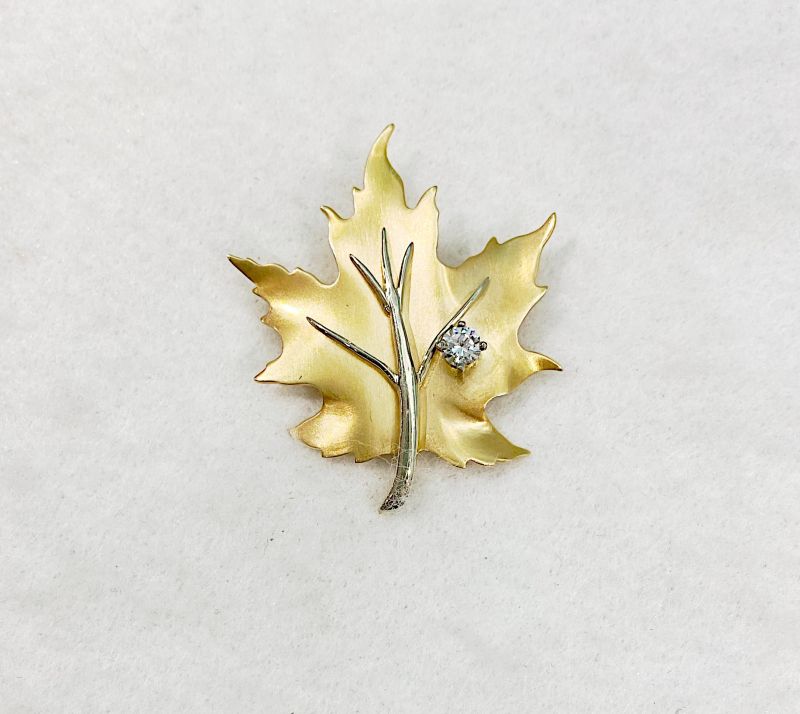 MANAGER’S SPECIAL Diamond set maple leaf brooch by Birks of Canada. Diamond weight approx 0.29ct. 14ct gold. Length 42mm. New replacement value £2,500.