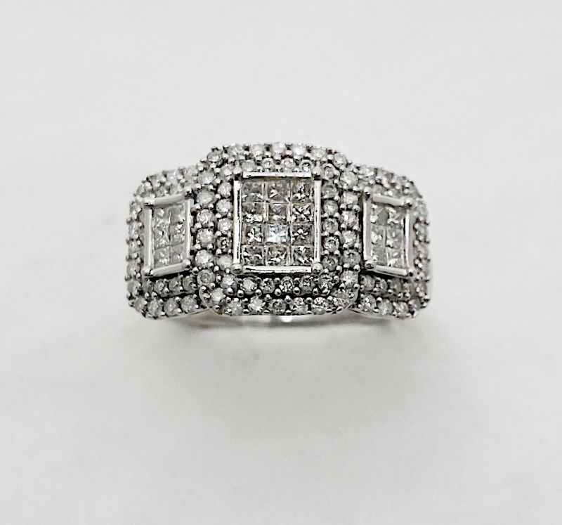 White gold & mixed cut diamond triple cluster ring. Round brilliant & princess cut pave diamonds, total weight 1.00ct (stated). 18ct gold. New replacement value £2,200