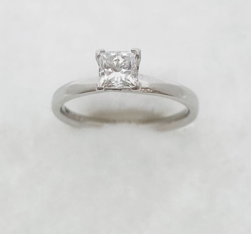 Platinum & princess cut diamond solitaire ring. GIA lab report, 0.53ct, colour F, clarity VVS1. New replacement value £3,000