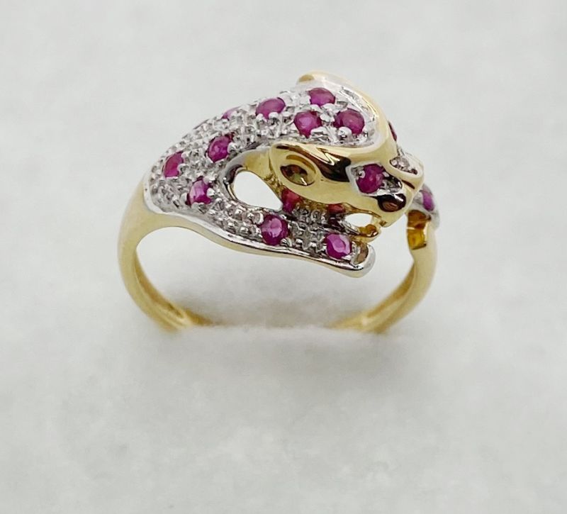 Ruby & diamond leopard head ring. Total ruby weight approx 0.31ct. 18ct gold. New replacement value £750
