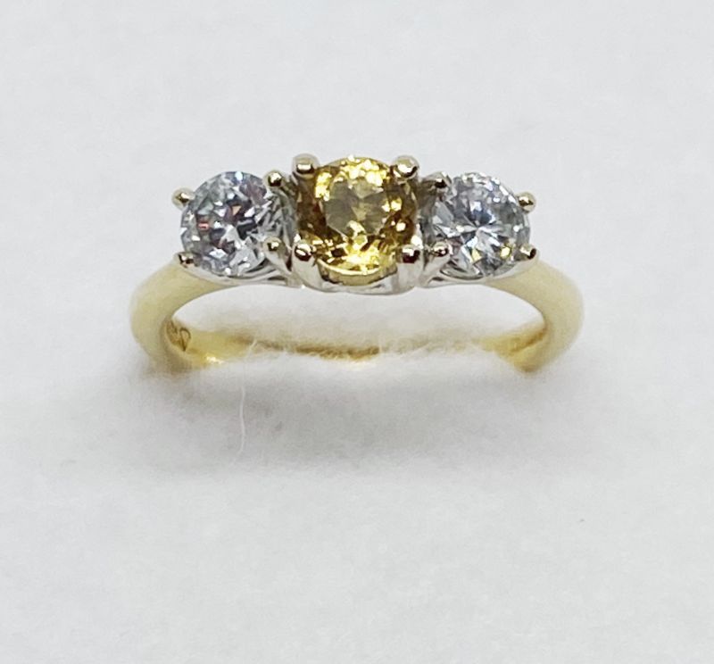 Round brilliant diamond and citrine three stone ring. Citrine weighs approx 0.50ct. Total diamond weight approx 0.70ct. Colour G-H, clarity SI assessed. 18ct yellow gold. New replacement value £2,800