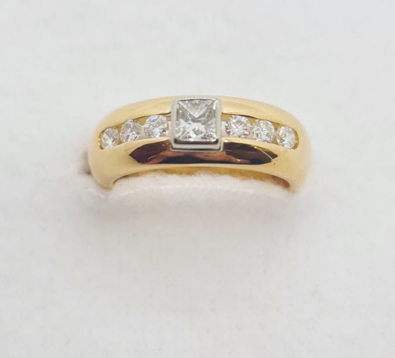 Vintage 22ct yellow gold & diamond wide band ring circa 1970. Principal princess cut diamond weighs approx 0.34ct with a further six channel set round brilliant cut diamonds, approx 0.36ct total, colour H-I, clarity SI1. 6.7mm wide. Weighs 12.6 grams. New replacement value £3,000