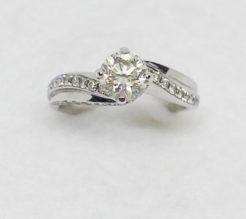 Round brilliant cut & pave diamond solitaire ring. Principal diamond certified by the GIA to weigh 0.90ct. Colour S-T, clarity VS1. Remaining diamonds weigh approx 0.40ct. Colour G-H, clarity VS-SI. 18ct white gold. New replacement value £4,300