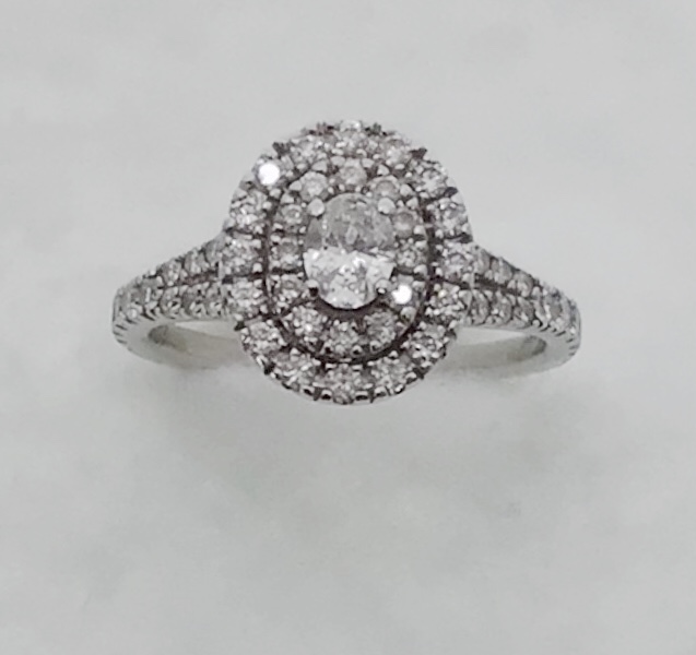 Neil Lane oval cut pavé diamond halo cluster ring. Total diamond weight approx 0.80ct, colour H-I, clarity SI2-I1 assessed. 14ct white gold. New replacement value £2,999.