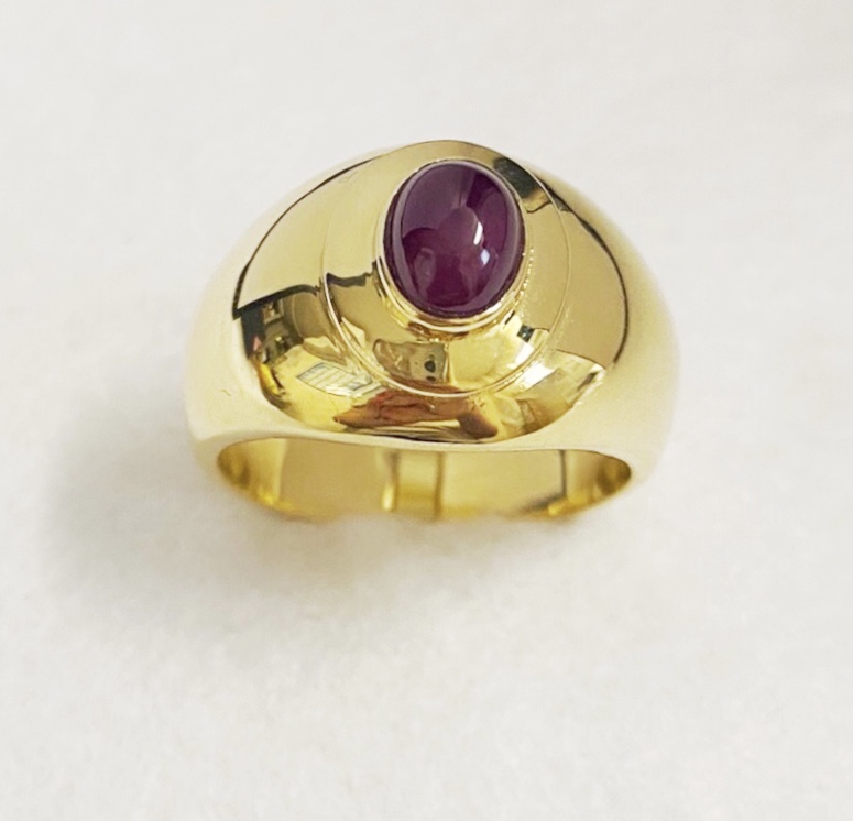 Yellow gold & cabochon ruby ring. Ruby weighs approx 1.78ct. 18ct gold. New replacement value £2,900.