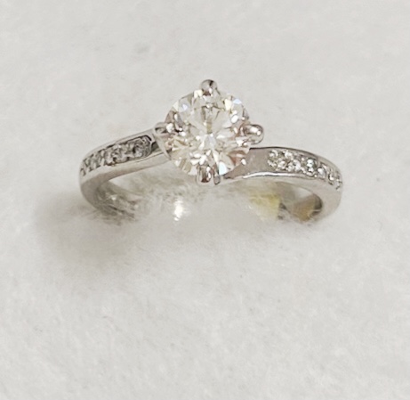REDUCED Platinum & diamond solitaire with diamond set shoulders. Principal diamond weighs approx 0.74ct. Colour H-I, clarity VS1-VS2 assessed. Remaining diamonds to shoulders weigh approx 0.08ct. New replacement value £4,000. Previously priced at £2,699.