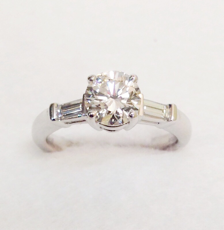 REDUCED Approx 1.06ct round brilliant cut & baguette cut diamond ring. Principal stone colour H-I, clarity VVS assessed. 18ct gold. New replacement value £16,850 Previously priced at £6,999