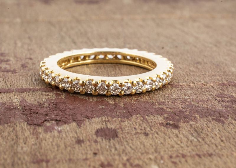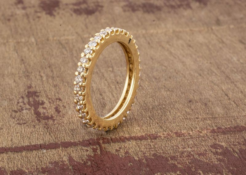REDUCED Yellow gold & pave diamond full eternity ring. Total weight approx 0.75ct, colour H-I, clarity SI1-SI2 assessed. 14ct gold. 2.5mm width. New replacement value £1,700. Previously priced at £799