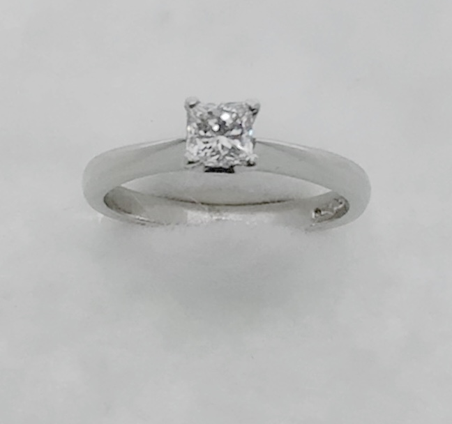 Platinum & princess cut diamond solitaire ring. Diamond certified by the EGL to weigh 0.43ct, colour G, clarity SI1. New replacement value £2,000.