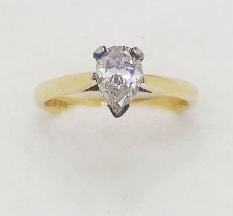 Classic pear cut diamond solitaire ring. Approx 0.84ct. Colour I-J, clarity P1 assessed. 18ct yellow gold. New replacement value £3,000