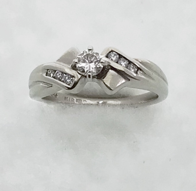 14ct white gold diamond solitaire twist ring. Main stone weighs approx. 0.16ct, colour G-H, clarity VS2 assessed. Total remaining diamond weight approx. 0.04ct. New replacement value £1,000.