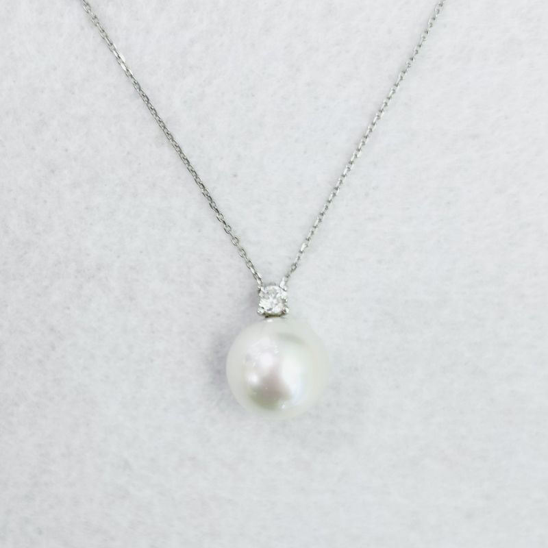 Platinum round brilliant cut diamond & south sea pearl necklace. Total diamond weight approx. 0.20ct, colour F-G, clarity VS2 assessed. Platinum expandable trace chain included, maximum length 18 inches. New replacement value £2,500.