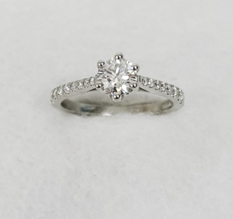 MANAGER’S SPECIAL Round brilliant cut & pavé diamond solitaire ring. Principal diamond certified by the GIA to weigh 0.61ct, colour D, clarity SI2 assessed. Remaining diamonds to shoulder and under bezel weigh approx 0.30ct. Platinum. New replacement price £3,500. Previously priced at £2,199.