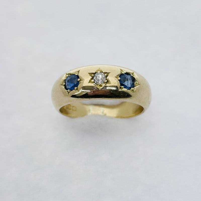 Edwardian diamond & sapphire band ring circa 1901. Total diamond weight approx. 0.06ct, colour H-I, clarity I1 assessed. Total sapphire weight approx. 0.30ct. 18ct yellow gold. Antique replacement value £900.