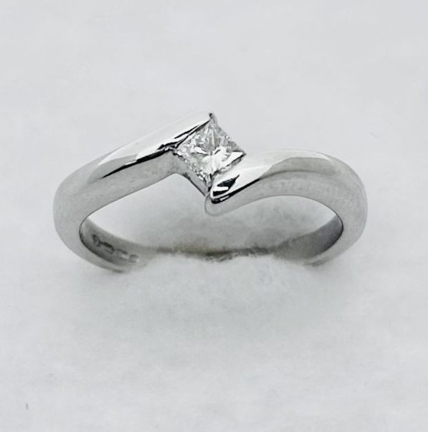 White gold & princess cut diamond solitaire twist ring. Diamond weight approx. 0.16ct, colour G-H, clarity VS1-VS2 assessed. 18ct gold. New replacement value £1,200.