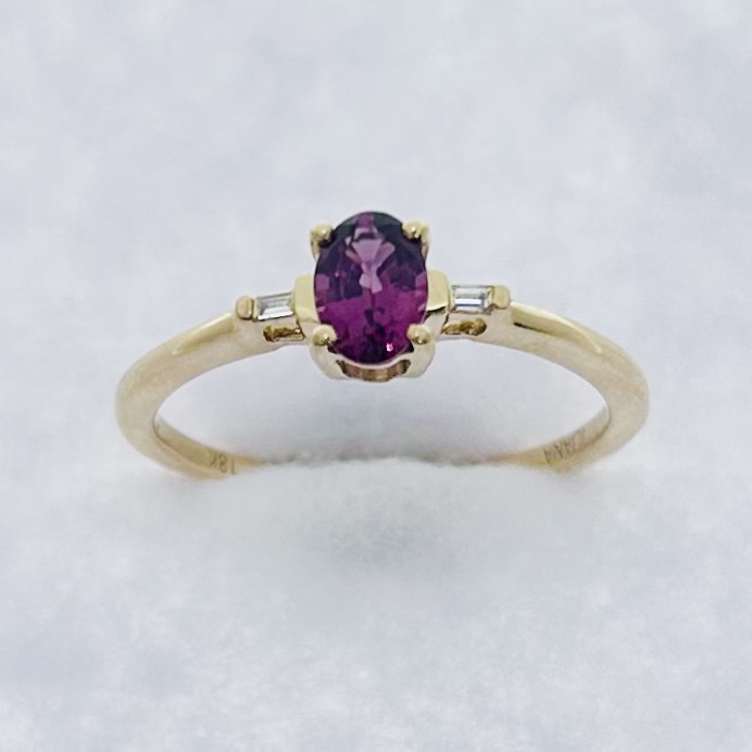 Pink spinel & baguette diamond cocktail ring. Spinel weighs approx. 0.70ct. Total diamond weight approx. 0.04ct, colour G-H, clarity VS1-VS2 assessed. 18ct yellow gold. New replacement value £700.