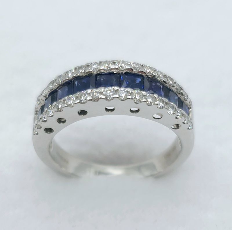 White gold sapphire & diamond band ring. Total sapphire weight approx. 1.86ct. Total diamond weight approx. 0.34ct, colour H-I, clarity SI1-I1 (assessed). 18ct gold. New replacement value £2,500.