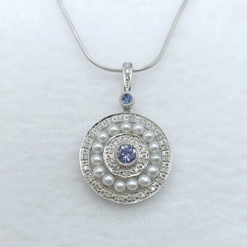 SECONDHAND GOLD Tanzanite & pearl pendant with 18″ snake chain. 9ct white gold.