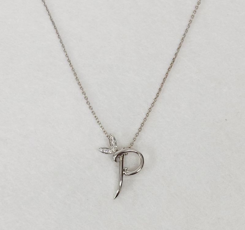 Boodles white gold & diamond love letter ‘P’ necklace. Total diamond weight approx 0.04ct. Colour G-H, clarity VS-SI assessed. Complete with 18″ spiga chain. 18ct gold. New replacement value £950.