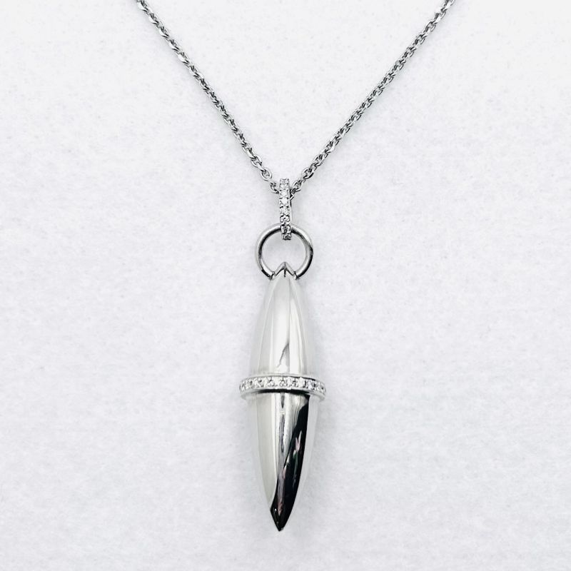 Boodles white gold & pavé diamond “Velocity” necklace. Total diamond weight 0.31ct, colour F-G, clarity VS1-VS2 assessed. 28 inch Boodles branded trace chain included. 18ct gold. New replacement value £6,900.