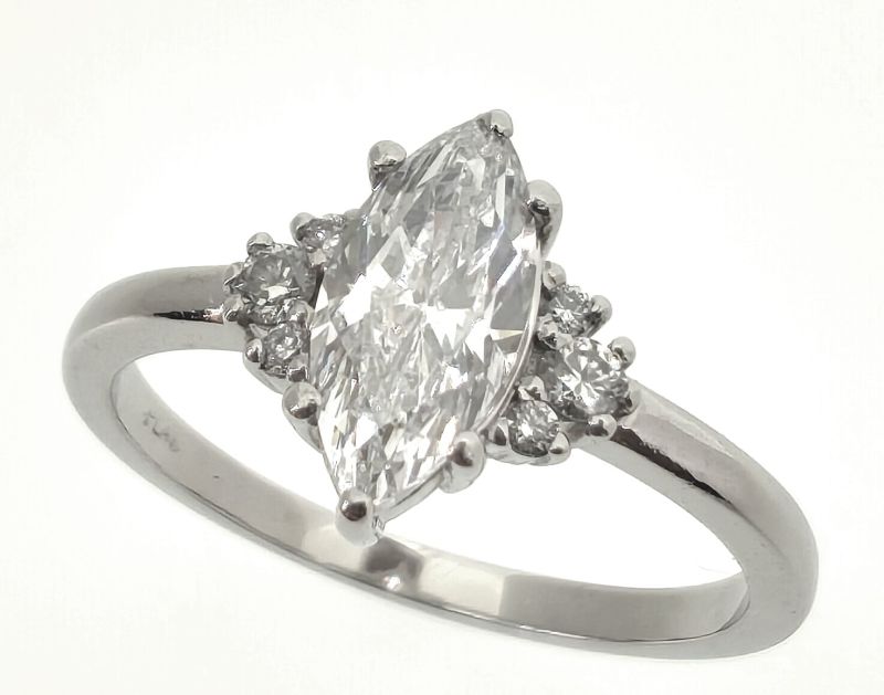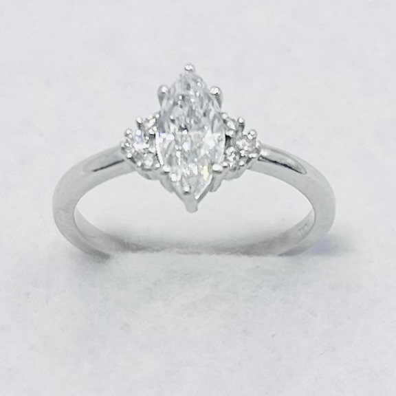 Platinum & marquise diamond solitaire ring. Diamonds certified by CGL. Marquise weighs 0.75ct, colour F, clarity SI1. Total diamond weight to sides 0.06ct, colour D-E, clarity VS. New replacement value £3,700.