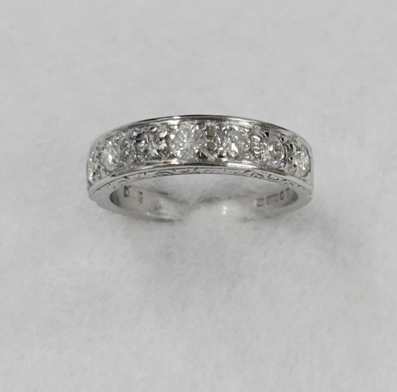 Vintage white gold & diamond half eternity ring. Total diamond weight approx 0.75ct. Colour G-H, clarity SI -I1 assessed. 18ct gold. New replacement value £2,000.