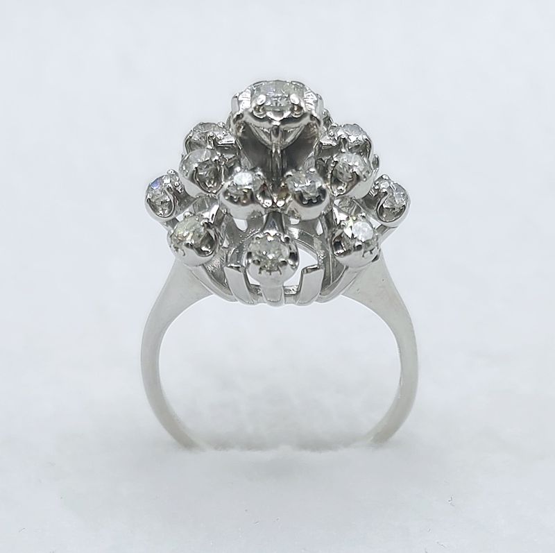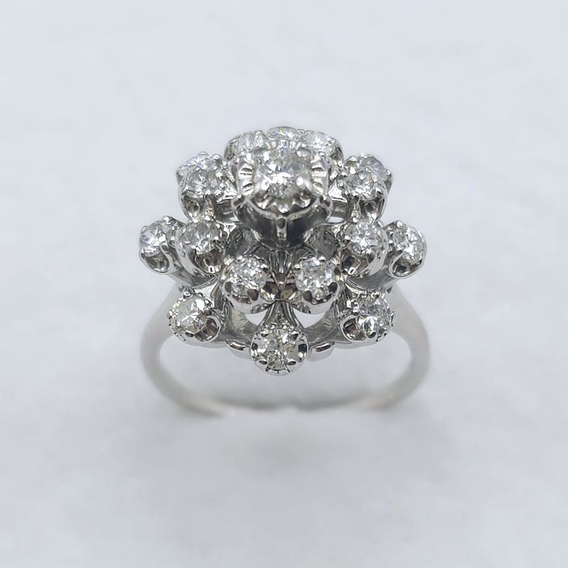 White gold diamond cluster ring. Total diamond weight approx. 1.00ct. Colour H-I, clarity I1 (assessed). 9ct gold. New replacement value £1,850.
