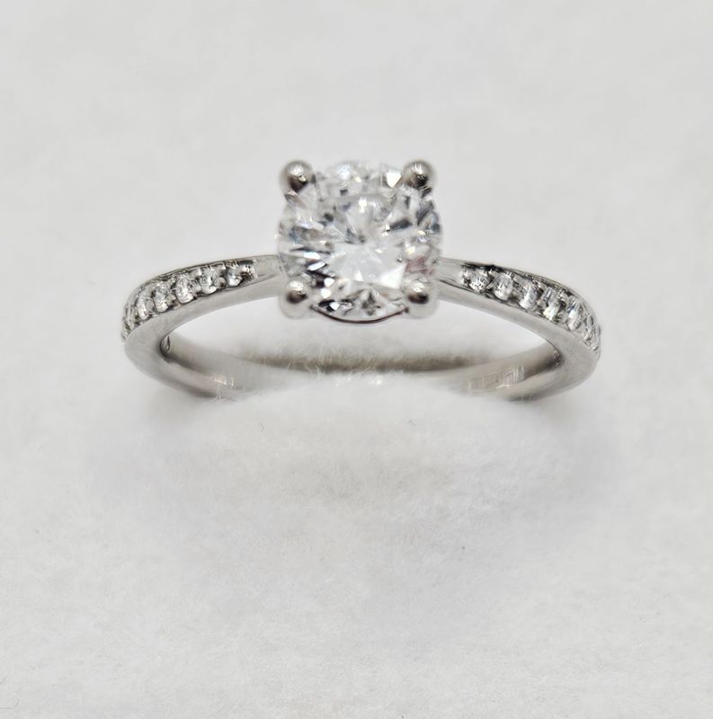 Round brilliant cut & pave diamond solitaire ring. Principal diamond weighs approx 0.90ct. Colour F-G, clarity SI2 assessed. Remaining diamonds weigh approx 0.15ct in total. Platinum. New replacement value £5,500