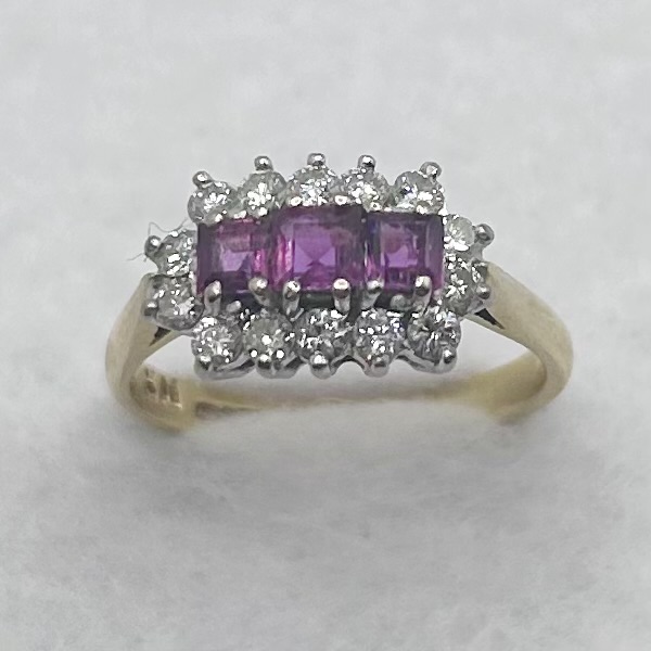 Classic triple ruby & diamond cluster ring. Total ruby weight approx. 0.63ct. Total diamond weight approx. 0.45ct, colour G-H, clarity I1 assessed. 18ct yellow gold. New replacement value £1,500.