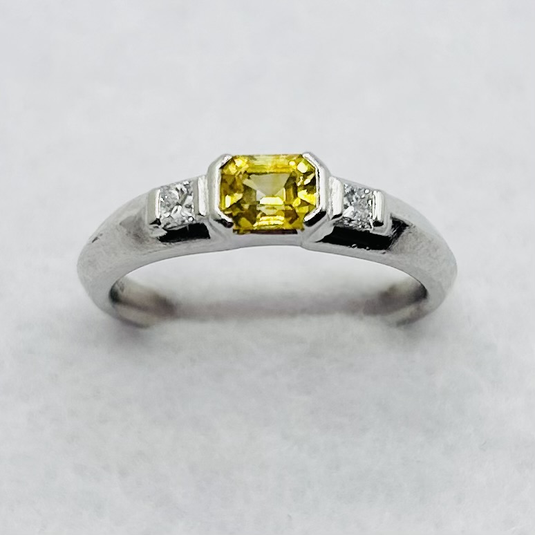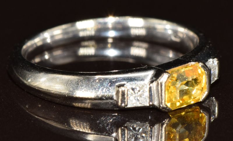 Yellow sapphire & diamond three stone ring. Sapphire weighs approx. 0.65ct. Total diamond weight approx. 0.12ct, colour G-H, clarity VS1-VS2 assessed. 18ct white gold. New replacement value £1,700.
