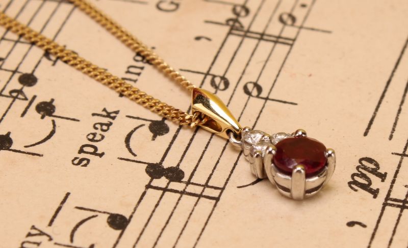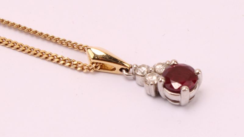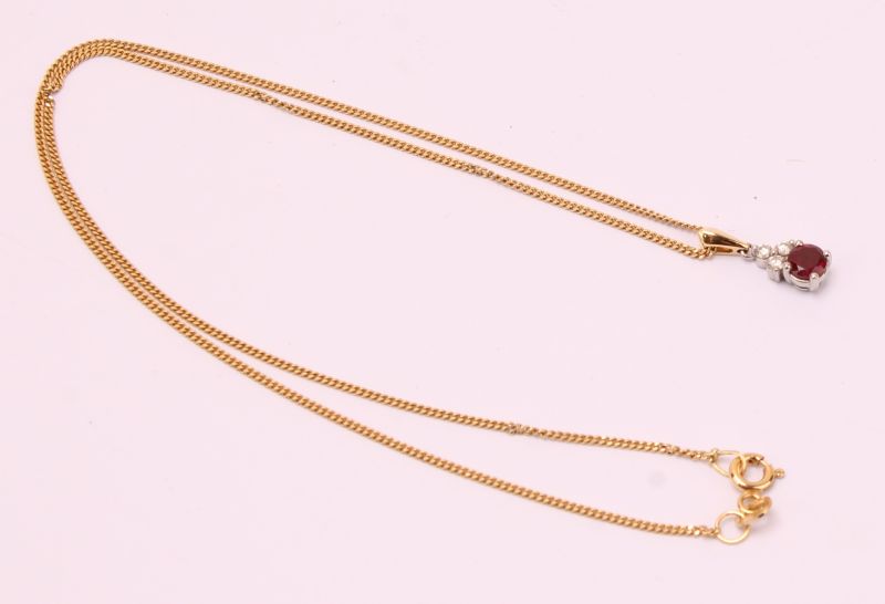 Yellow gold & platinum ruby & diamond drop necklace. Ruby weighs approx. 0.39ct. Total diamond weight approx. 0.10ct, colour G-H, clarity SI1-SI2 assessed. 16 inch curb chain included. 18ct gold. New replacement value £1,300.