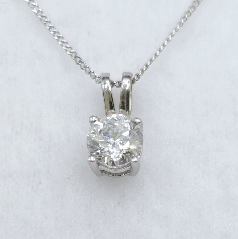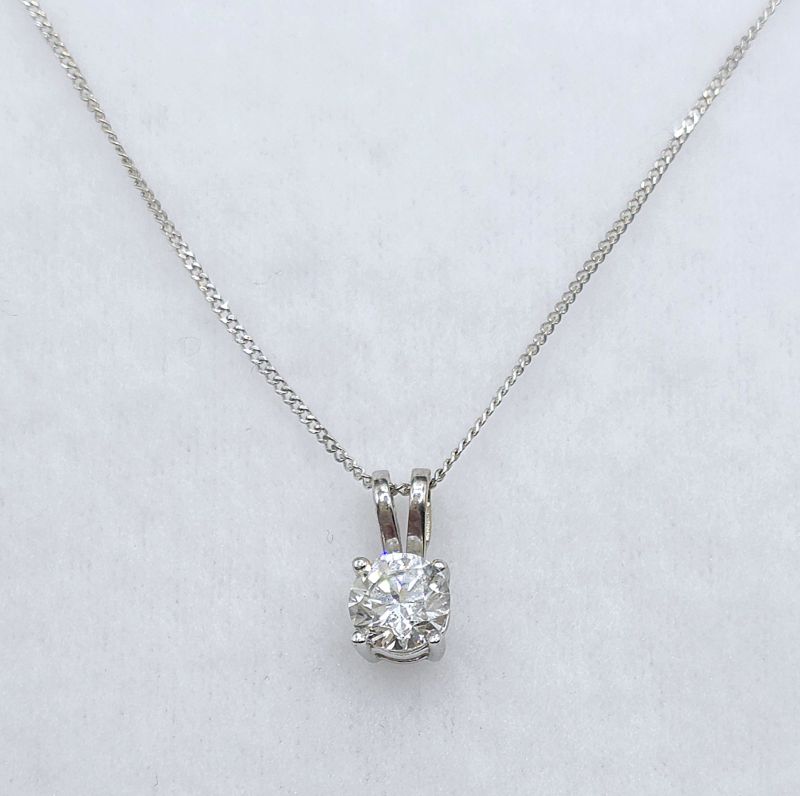 White gold round brilliant cut diamond pendant and chain. Diamond weighs approx. 0.45ct, colour G-H, clarity SI. 18 inch chain included. New replacement value £1,700.