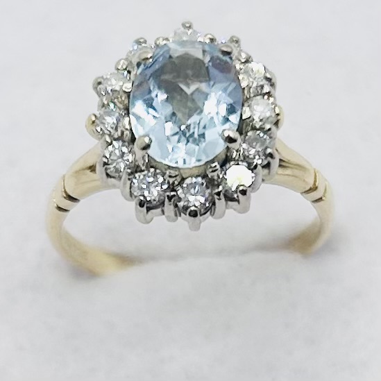 Classic aquamarine & diamond cluster ring circa. 1990. Aquamarine report confirms weight 1.38ct. Total diamond weight approx. 0.60ct, colour G-H, clarity VS-SI assessed. 18ct yellow gold. New replacement value £2,900.