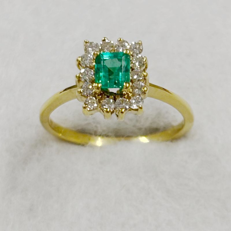 Emerald & diamond cluster ring. Emerald weighs approx 0.52ct. Total diamond weight approx 0.35ct. Colour G-H, clarity VS-SI assessed. 18ct gold. New replacement value £2,800.