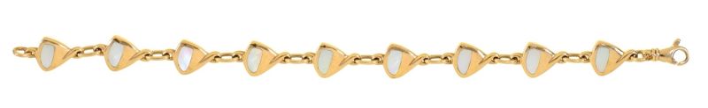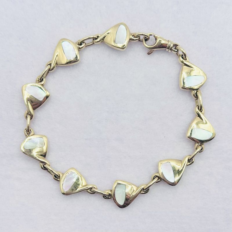 Handcrafted mother of pearl inlay chain link bracelet by C W Sellors. Length 197mm. 9ct yellow gold. New replacement value £2,500.