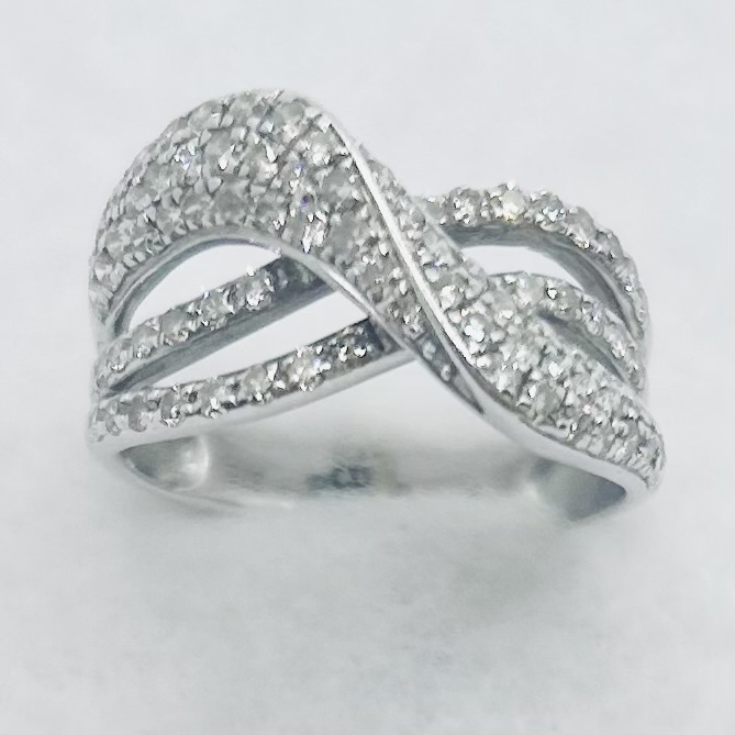 White gold & pavè diamond wide band crossover ring. Total diamond weight approx. 1.00ct, colour J-M, clarity I1 assessed. 9ct gold. New replacement price £1,200.