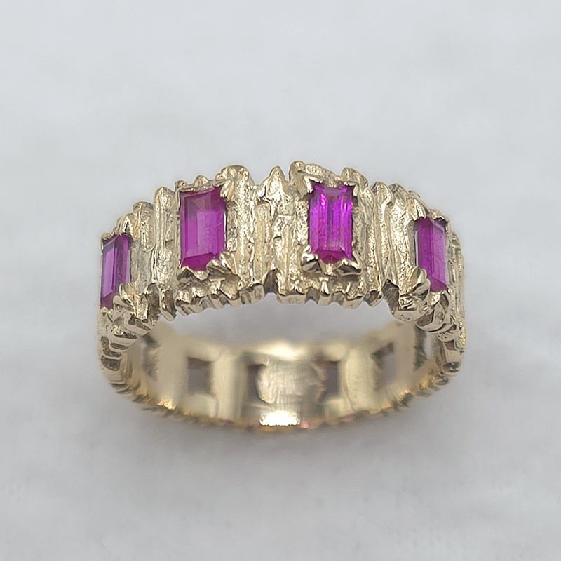 Vintage style bark effect ruby ring, circa 2005. Total ruby weight approx. 0.64ct (assessed). 9ct yellow gold.