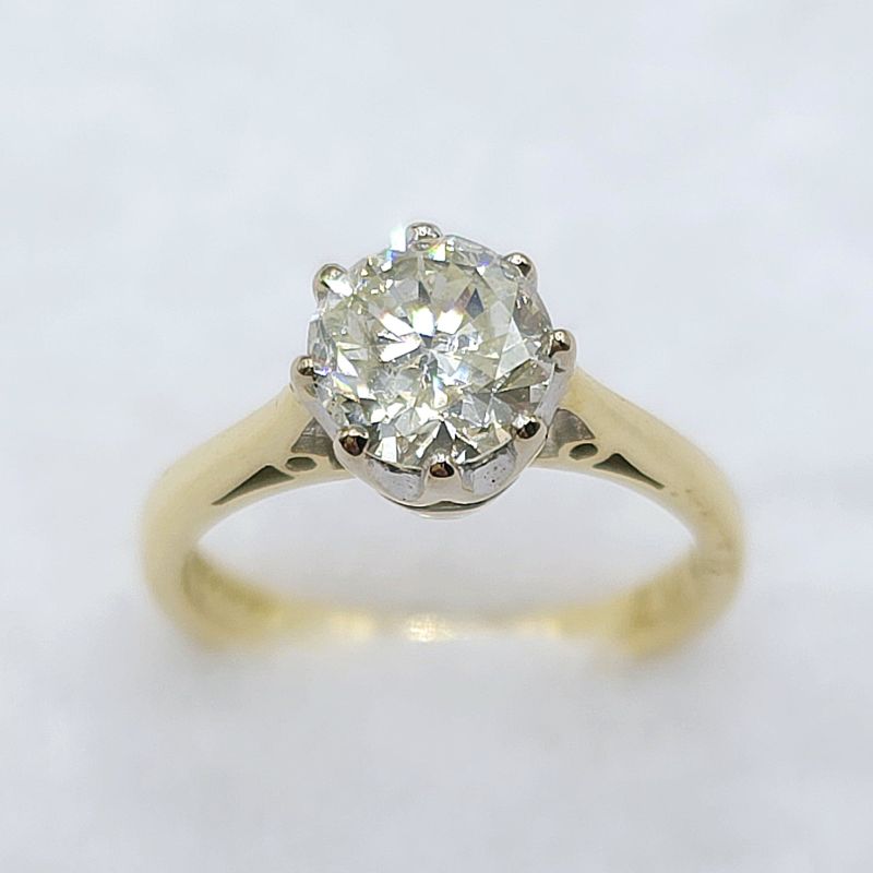 Yellow gold & round brilliant cut diamond solitaire ring. Diamond weighs approx. 1.07ct, colour L-M, clarity I1-I2 (assessed). 18ct gold. New replacement price £4,500.