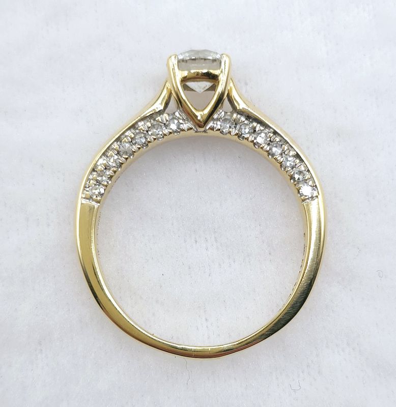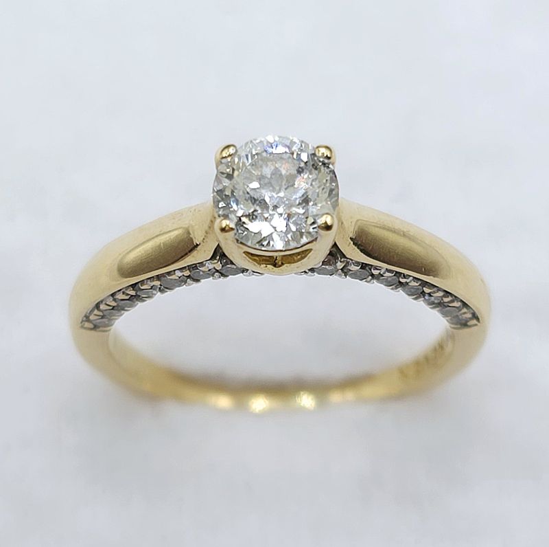 FOREVER™ modified brilliant & pavé diamond solitaire ring. Principal diamond certified by IGI to weigh 0.65ct, colour I-J, clarity I1-I2. Pavé diamond set profile. 18ct yellow gold. New replacement price £3,300.
