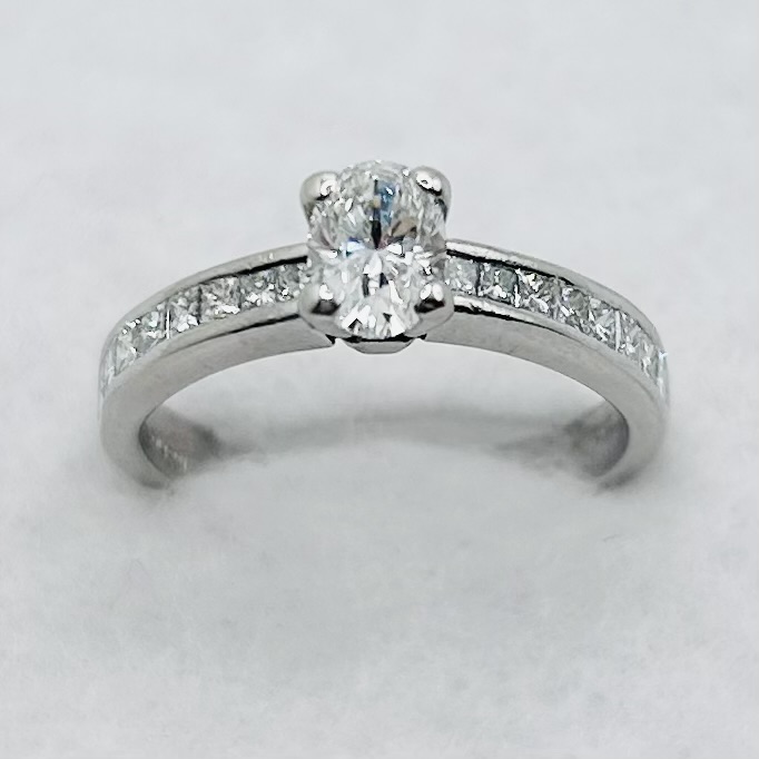 Oval cut & pavé diamond solitaire ring. Oval diamond weighs approx. 0.53ct, colour G-H, clarity VS1-VS2 assessed. Total diamond weight to shoulders approx. 0.42ct, colour G-H-I, clarity VS-SI assessed. Platinum. New replacement price £3,500.