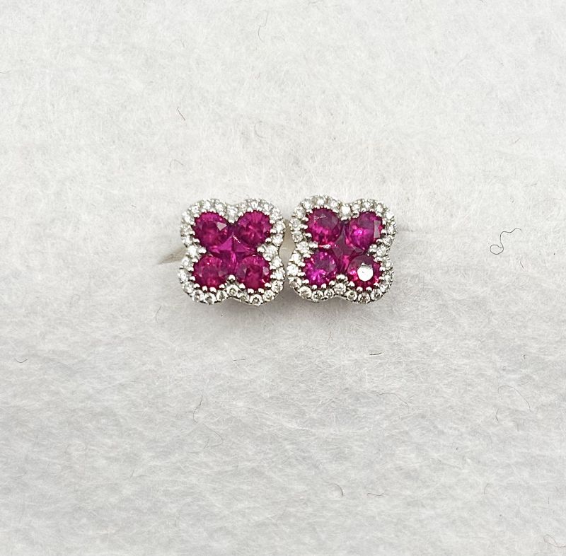 Ruby & diamond alhambra stud earrings by Fred Ullmann. Total ruby weight approx 0.80ct. Total diamond weight approx 0.28ct. Colour F-G-H, clarity VS-SI assessed. 18ct gold. New replacement price £2,000.