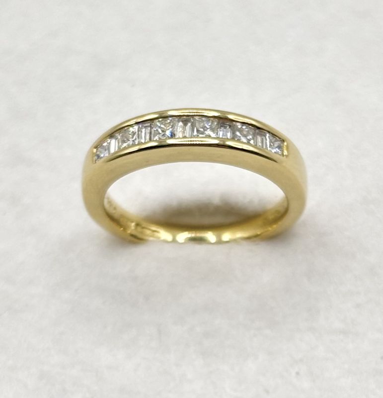 Yellow gold & mixed cut diamond half eternity ring. Total diamond weight 0.50ct (stated). Colour G-H-I, clarity VS-SI assessed. 18ct gold. New replacement price £2,400.