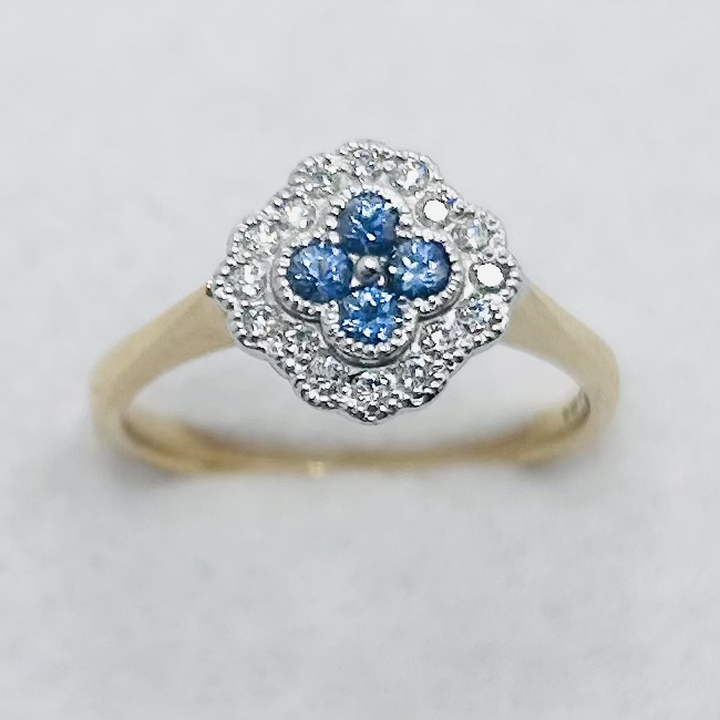 Ceylon sapphire & diamond cluster ring. Total sapphire weight approx. 0.20ct. Total diamond weight approx. 0.20ct, colour G-H, clarity VS-SI assessed. 18ct yellow gold. New replacement price £2,000.
