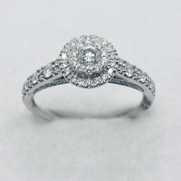 Jenny Packham white gold & diamond halo cluster ring. Total diamond weight approx. 0.75ct, colour G-H-I, clarity SI-I1 assessed. 18ct gold. New replacement price £3,000.