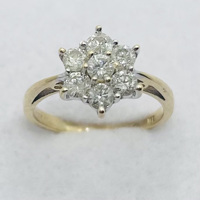 Classic round brilliant cut diamond cluster ring. Total diamond weight approx. 0.85ct, colour J-K, clarity I2 assessed. 18ct yellow gold. New replacement price £1,900.