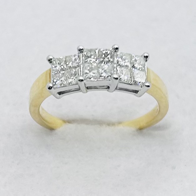 Tile set diamond triple cluster ring. Total diamond weight approx. 1.00ct, colour H-I, clarity VS-SI assessed. 18ct yellow gold. New replacement price £2,500.