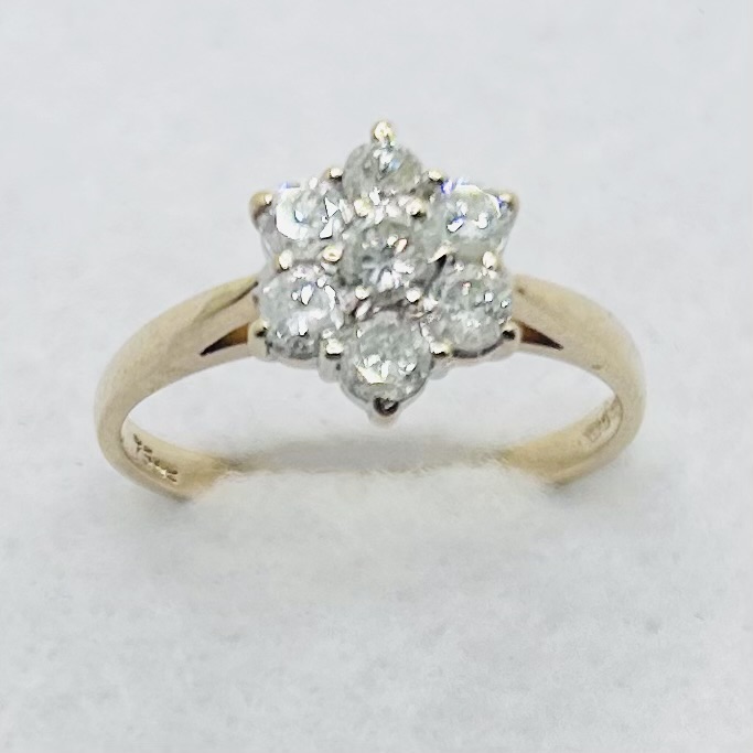 Classic diamond cluster ring. Total diamond weight approx. 0.75ct, colour H-I, clarity I2-13 assessed. 9ct yellow gold. New replacement price £1,100.