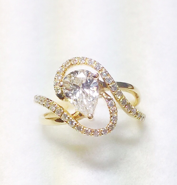 Approx 1.06ct pear cut diamond & pave diamonds crossover ring. Principal stone colour H-I, clarity SI2-P1 assessed. 18ct gold. New replacement value £5,399